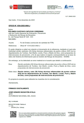 Mediante el Oficio N° 1519-2025-ANA-J, la Autoridad Nacional del Agua remite treinta y seis (36) fichas técnicas referenciales de puntos críticos 2025 de los departamentos Tumbes, San Martin, Loreto, Puno y Madre de Dios; como propuestas de intervenciones de prevención.