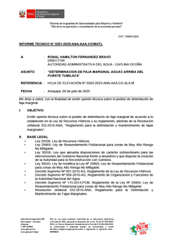 El presente Informe técnico tiene como objetivo, realizar la opinión técnica sobre el pedido de delimitación de faja marginal de acuerdo a lo establecido en la Ley de Recursos Hídricos y su reglamento; además de la Resolución Jefatural 332-2016-ANA, “Reglamento para la delimitación y mantenimiento de fajas marginales