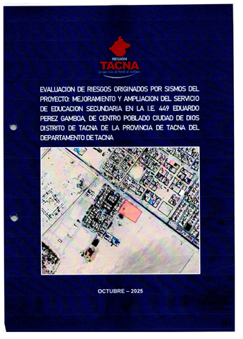 El objetivo del presente informe es determinar de niveles de riesgo por peligro sísmico en el área de influencia del proyecto "Mejoramiento y ampliación del servicio de educación secundaria en la institución educativa 449 Eduardo Perez Gamboa, de centro poblado Ciudad de Dios distrito de Tacna de la provincia de Tacna del departamento de Tacna"