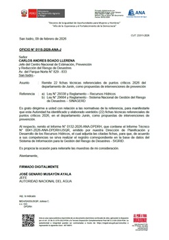 Mediante el Oficio N° 0082-2026-ANA-J, la Autoridad Nacional del Agua remite cuatros (04) fichas técnicas referenciales de puntos críticos 2026 del departamento de Junín; como propuestas de intervenciones de prevención.