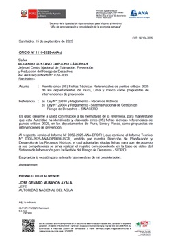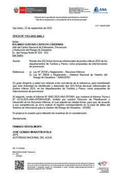 Mediante el Oficio N° 1110-2025-ANA-J, la Autoridad Nacional del Agua remite dos (05) fichas técnicas referenciales de puntos críticos 2025 de los departamentos de Piura, Lima y Pasco como propuestas de intervenciones de prevención.