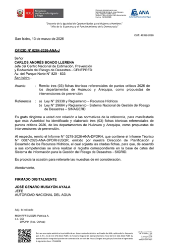 Mediante el Oficio N° 0284-2026-ANA-J, la Autoridad Nacional del Agua remite tres (03) fichas técnicas referenciales de puntos críticos 2026 de los departamentos de Huánuco y Arequipa, como propuestas de intervenciones de prevención.