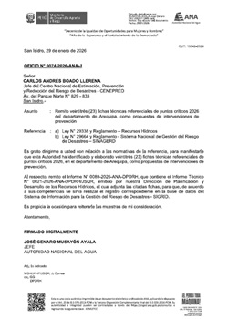 Mediante el Oficio N° 0074-2026-ANA-J, la Autoridad Nacional del Agua remite veintitres (23) fichas técnicas referenciales de puntos críticos 2026 del departamento de Arequipa; como propuestas de intervenciones de prevención.