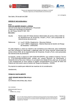 Mediante el Oficio N° 0431-2026-ANA-J, la Autoridad Nacional del Agua remite once (11) fichas técnicas referenciales de puntos críticos 2026 de la provincia y departamento de Arequipa, como propuestas de intervenciones de prevención.