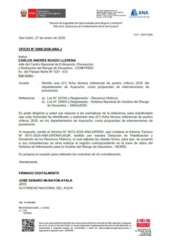 Mediante el Oficio N° 0068-2026-ANA-J, la Autoridad Nacional del Agua remite una (01) ficha técnica referencial de puntos críticos 2026 del departamento de Ayacucho; como propuestas de intervenciones de prevención.
