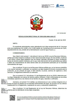 Resolución Directoral N° 0369-2026-ANA-AAA.CF: Delimitación de faja marginal de un tramo del río Yarucaya, en el distrito de Cochamarca, provincia de Oyón, departamento de Lima