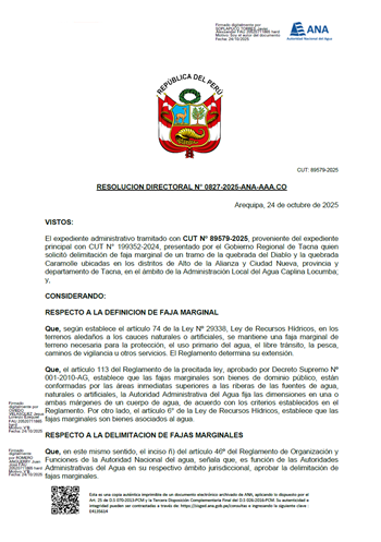 Resolución Directoral N° 0827-2025-ANA-AAA.CO: Delimitación de la faja marginal de un tramo de la quebrada Caramolle, distrito de Alto de la Alianza y Ciudad Nueva, provincia y departamento de Tacna