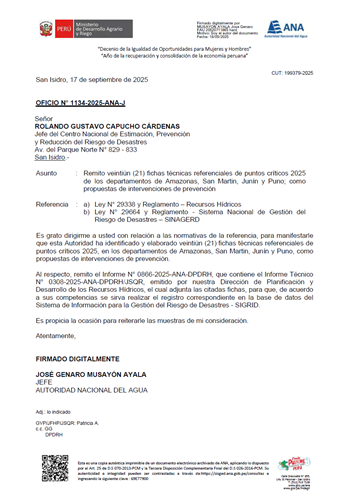 Mediante el Oficio N° 1110-2025-ANA-J, la Autoridad Nacional del Agua remite dos (05) fichas técnicas referenciales de puntos críticos 2025 de los departamentos de Piura, Lima y Pasco como propuestas de intervenciones de prevención.
