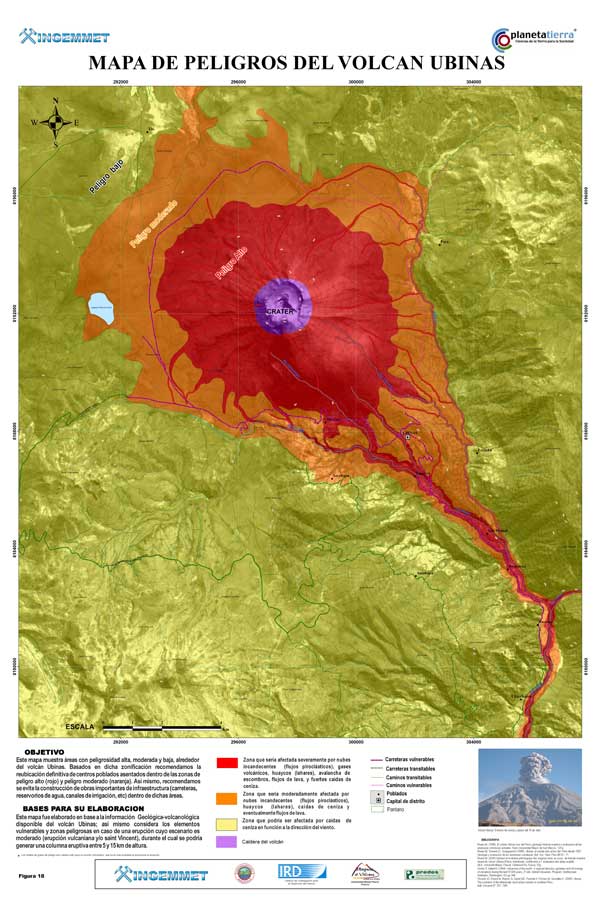 Este mapa muestra áreas con peligrosidad alta, moderada y baja, alrededor del volcan Ubinas.