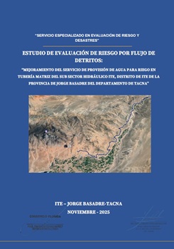 El presente estudio tiene como objetivo identificar y caracterizar el peligro por flujo de detritos, evaluar la exposición y vulnerabilidad en el área de influencia, estimar los niveles de riesgo y las posibles pérdidas asociadas, y proponer medidas de control orientadas a la prevención y reducción del riesgo de desastres en el área de influencia del proyecto del sub sector hidráulico Ite, distrito de Ite de la provincia de Jorge Basadre del departamento de Tacna.