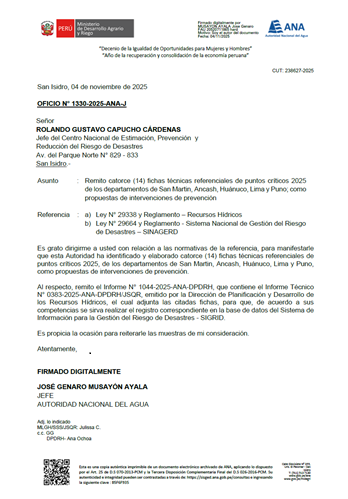 Mediante el Oficio N° 1330-2025-ANA-J, la Autoridad Nacional del Agua remite catorce (14) fichas técnicas referenciales de prevención de puntos críticos 2025 de los departamentos de San Martín, Áncash, Huánuco, Lima y Puno; como propuestas de intervenciones de prevención.