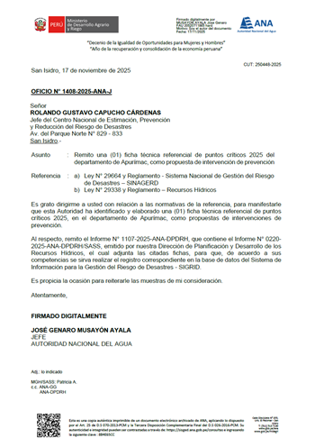 Mediante el Oficio N° 1408-2025-ANA-J, la Autoridad Nacional del Agua remite una (01) ficha técnica referenciales de puntos críticos 2025, como propuestas de intervenciones de prevención en el departamento de Apurímac.
