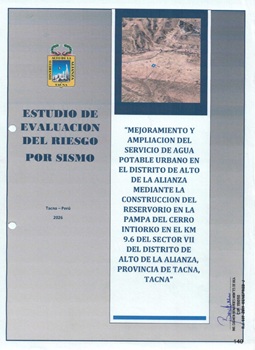 El presente estudio tiene como objetivo determinar el nivel de riesgo originado por un peligro por sismo del proyecto "Mejoramiento y ampliación del servicio de agua potable urbano en el distrito de Alto de la Alianza mediante la construcción del reservorio en la Pampa del Cerro Intiorko, en el km 9.6 del sector VII del distrito Alto de la Alianza, provincia y departamento de Tacna"