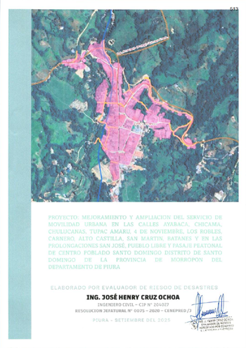 Evaluación del riesgo de desastres del proyecto "Mejoramiento y ampliación del servicio de movilidad urbana en las calles Ayabaca, Chicama, Chulucanas, Túpac Amarú, 4 de Noviembre, Los Robles, Carnero, Alto Castilla, San Martín, Batanes y en las prolongaciones San José, Pueblo Libre y pasaje peatonal de centro poblado Santo Domingo, distrito de Santo Domingo, provincia de Morropón, departamento de Piura"