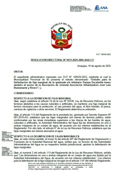 La presente resolución aprueba la delimitación de faja marginal de la quebrada s/n tributario Pampa Escalerilla tramo aledaño al sector de la Asociación de vivienda Asociación Urbanizadora José Luis Bustamante y Rivero, ubicado en el distrito Cerro Colorado, provincia y departamento de Arequipa. La faja presenta 10 vértices en la margen derecha y 10 vértices en la margen izquierdo, con ancho de faja marginal de 10 m. y con un tramo complementario de 13 vértices en la margen derecha y margen izquierdo.