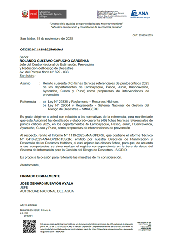 Mediante el Oficio N° 1415-2025-ANA-J, la Autoridad Nacional del Agua remite cuarenta (40) fichas técnicas referenciales de prevención de puntos críticos 2025 de los departamentos de Lambayeque, Pasco, Junín, Huancavelica, Ayacucho, Cusco y Puno; como propuestas de intervenciones de prevención.