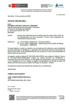 Mediante el Oficio N° 1389-2025-ANA-J, la Autoridad Nacional del Agua remite ocho (08) fichas técnicas referenciales de prevención de puntos críticos 2025 de los departamentos de Lima, Ayacucho y Cusco; como propuestas de intervenciones de prevención.
