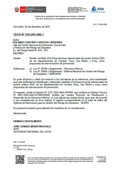 Mediante el Oficio N° 1524-2025-ANA-J, la Autoridad Nacional del Agua remite veintitrés (23) fichas técnicas referenciales de puntos críticos 2025 de los departamentos de Tumbes, Piura, San Martin y Lima; como propuestas de intervenciones de prevención.