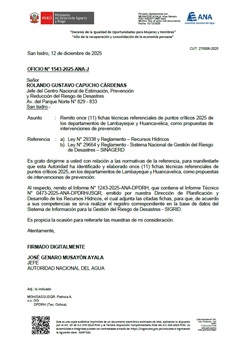 Mediante el Oficio N° 1450-2025-ANA-J, la Autoridad Nacional del Agua remite veintiséis (26) fichas técnicas referenciales de puntos críticos 2025 de los departamentos de Lambayeque, La Libertad, Cajamarca, Junín, Ayacucho y Cusco; como propuestas de intervenciones de prevención.