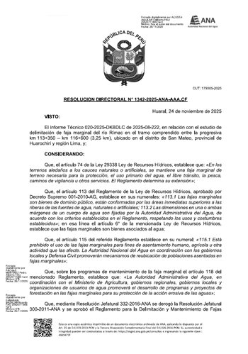 La presente resolución aprueba la delimitación de la faja marginal de la Quebrada Ceniza y su Aportante 1, cauce principal una longitud de 2.85km, y su aportante de 0.88km, la quebrada Ceniza cuenta con un total de 39 hitos georreferenciados y validados en coordenadas UTM WGS84, de los cuales 19 hitos corresponde a la margen derecha y 20 hitos a la margen izquierda, asimismo, su Aportante con un total de 26 hitos georreferenciados y validados en coordenadas UTM WGS84, de los cuales 13 hitos corresponden a la margen derecha y 13 hitos a la margen izquierda.