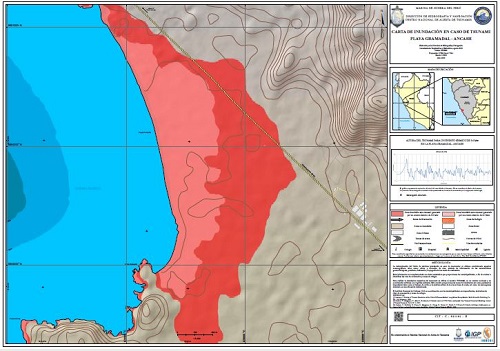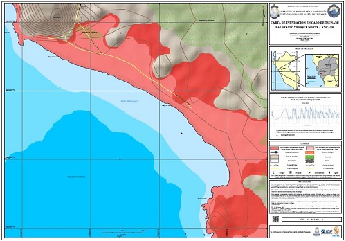 La carta presenta la zona inundable ante tsunami generado por un evento sísmico de 8.5Mw y 9.0 Mw en el distrito y provincia Huarmey, departamento Ancash.