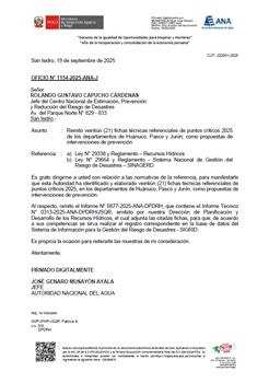 Mediante el Oficio N° 1154-2025-ANA-J, la Autoridad Nacional del Agua remite veintiún (21) fichas técnicas referenciales de prevención de puntos críticos 2025 de los departamentos de Huánuco, Pasco y Junín, como propuestas de intervenciones de prevención.