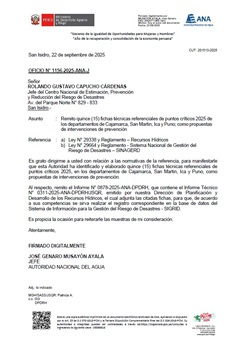 Mediante el Oficio N° 1156-2025-ANA-J, la Autoridad Nacional del Agua remite quince (15) fichas técnicas referenciales de prevención de puntos críticos 2025 de los departamentos de Cajamarca, San Martin, Ica y Puno, como propuestas de intervenciones de prevención.