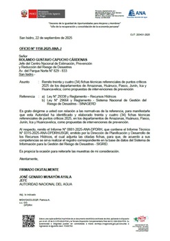 Mediante el Oficio N° 1158-2025-ANA-J, la Autoridad Nacional del Agua remite treinta y cuatro (34) fichas técnicas referenciales de prevención de puntos críticos 2025 de los departamentos de Amazonas, Huánuco, Pasco, Junín, Ica y Huancavelica, como propuestas de intervenciones de prevención.