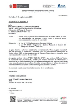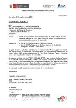 Mediante el Oficio N° 1111-2025-ANA-J, la Autoridad Nacional del Agua remite cinco (05) fichas técnicas referenciales de prevención de puntos críticos 2025 de los departamentos de Huánuco, Pasco, Junín y Ayacucho, como propuestas de intervenciones de prevención.