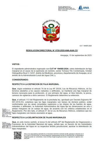 Resolución Directoral N° 0720-2025-ANA-AAA.CO: Delimitación de la faja marginal del cauce de la quebrada sin nombre, sector Tomasa Tito Condemayta, Unidad Hidrográfica Nivel 5-13257, distrito de Miraflores, provincia y departamento de Arequipa