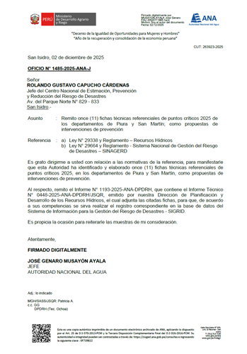 Mediante el Oficio N° 1485-2025-ANA-J, la Autoridad Nacional del Agua remite once (11) fichas técnicas referenciales de puntos críticos 2025 de los departamentos de departamentos de Piura y San Martín; como propuestas de intervenciones de prevención.