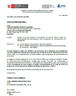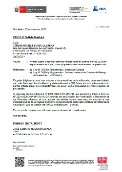 Mediante el Oficio N° 0018-2026-ANA-J, la Autoridad Nacional del Agua remite dieciocho (18) fichas técnicas referenciales de puntos críticos 2026 de los departamentos de Piura, Lima, Puno y Tacna; como propuestas de intervenciones de prevención.