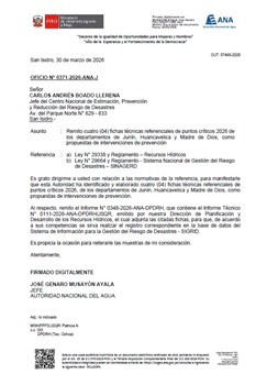 Mediante el Oficio N° 0371-2026-ANA-J, la Autoridad Nacional del Agua remite cuatro (04) fichas técnicas referenciales de puntos críticos 2026 de los departamentos de Junín, Huancavelica y Madre de Dios, como propuestas de intervenciones de prevención.