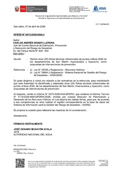 Mediante el Oficio N° 0372-2026-ANA-J, la Autoridad Nacional del Agua remite siete (07) fichas técnicas referenciales de puntos críticos 2026 de los departamentos de Tumbes, La Libertad, Lima, Huánuco y Arequipa, como propuestas de intervenciones de prevención.