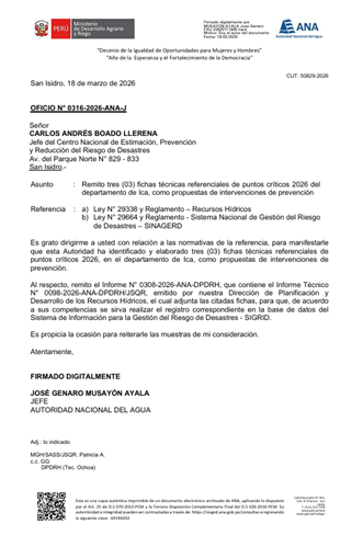 Mediante el Oficio N° 0316-2026-ANA-J, la Autoridad Nacional del Agua remite tres (03) fichas técnicas referenciales de puntos críticos 2026 de los departamentos de Huánuco y Arequipa, como propuestas de intervenciones de prevención.
