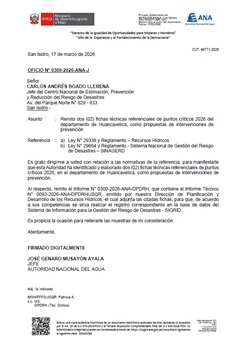 Mediante el Oficio N° 0309-2026-ANA-J, la Autoridad Nacional del Agua remite dos (02) fichas técnicas referenciales de puntos críticos 2026 del departamento de Huancavelica, como propuestas de intervenciones de prevención.