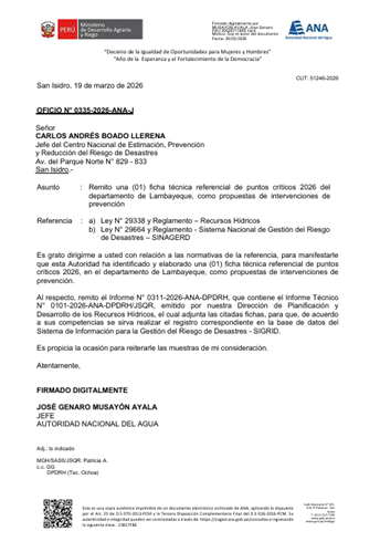 Mediante el Oficio N° 0335-2026-ANA-J, la Autoridad Nacional del Agua remite una (01) ficha técnica referencial de puntos críticos 2026 del departamento de Lambayeque, como propuestas de intervenciones de prevención.