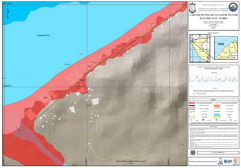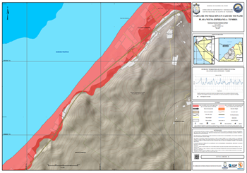 La carta presenta la zona inundable ante tsunami generado por un evento sísmico de 8.5Mw y 9.0 Mw en el distrito de Tambo de Mora, provincia Chincha, departamento Ica.