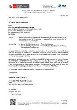 Mediante el Oficio N° 0465-2026-ANA-J, la Autoridad Nacional del Agua remite cuatro (04) fichas técnicas referenciales de puntos críticos 2026 de los departamentos de Amazonas y Huancavelica, como propuestas de intervenciones de prevención.