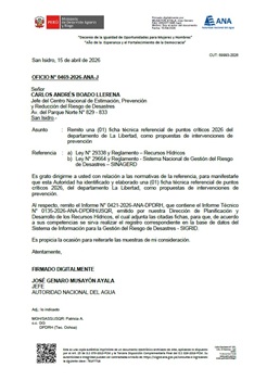 Mediante el Oficio N° 0469-2026-ANA-J, la Autoridad Nacional del Agua remite una (01) ficha técnica referencial de puntos críticos 2026 del departamento de La Libertad, como propuestas de intervenciones de prevención.