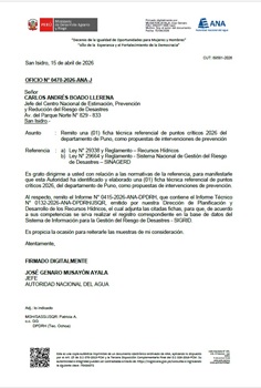 Mediante el Oficio N° 0470-2026-ANA-J, la Autoridad Nacional del Agua remite una (01) ficha técnica referencial de puntos críticos 2026 del departamento de Puno, como propuestas de intervenciones de prevención.