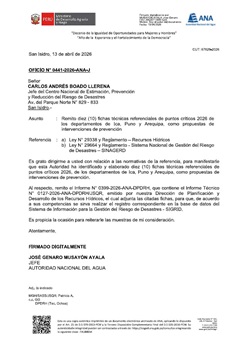 Mediante el Oficio N° 0333-2026-ANA-J, la Autoridad Nacional del Agua remite dos (02) fichas técnicas referenciales de puntos críticos 2026 de la provincia y departamento de Arequipa, como propuestas de intervenciones de prevención.