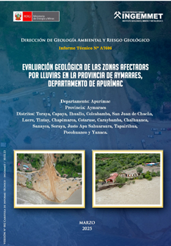 El presente informe tiene como objetivos evaluar y caracterizar los peligros geológicos por movimientos en masa originadas por las lluvias ocurridas y realizar el inventario de peligros geológicos y zonas críticas en los distritos de Cotaruse, Caraybamba, Chalhuanca, Soraya, Sañayca, Tapairihua, Justo Apu Sahuaraura, Pocohuanca, Yanaca, Toraya, Capaya, Ihuallo, Colcabamba, San Juan de Chacña, Lucre, Tintay y Chapimarca; proponer medidas de prevención, reducción y mitigación ante peligros geológicos evaluados en la etapa de campo, para los distritos evaluados